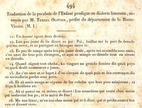 Traduction de la parabole de l'Enfant Prodigue, en patois limousin d'une partie de l'arrondissement de Confolens, en dialecte limousin de Haute-Vienne, en patois limousin de l'arrondissement de St-Yrieix.